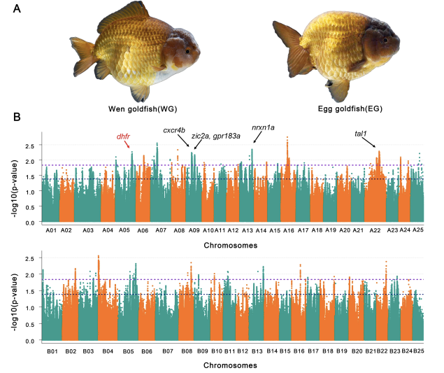 背鰭作為金魚(yú)一重要的表型特征,在不同變種中形態(tài)不一,背鰭是區(qū)分Wen金魚(yú)和Egg金魚(yú)的顯著特征,背鰭的縮小是Egg金魚(yú)進(jìn)化的關(guān)鍵特征。通過(guò)Wen金魚(yú)和Egg金魚(yú)雜交后代F1背鰭性狀分離比,暗示了了背鰭特征受多個(gè)基因位點(diǎn)控制,可能具有母體遺傳效應(yīng)。對(duì)96只有背鰭和87只無(wú)背鰭金魚(yú)的全基因組關(guān)聯(lián)分析GWAS研究分析發(fā)現(xiàn)跨越13條染色體上的8.96 Mb區(qū)域上的378個(gè)基因與背鰭性狀相關(guān)(圖6),85.2% (322)個(gè)基因位于A亞基因組,大部分位于五條染色體上,包括ChrA09,ChrA07,ChrA22,ChrA16和ChrA05,比位于B亞基因組上的背鰭相關(guān)基因的數(shù)量高得多,這表明背鰭相關(guān)基因不對(duì)稱的亞基因組分布,GO和KEGG分析表明,該性狀的候選基因可能參與了“細(xì)胞表面受體信號(hào)傳導(dǎo)”途徑,“信號(hào)轉(zhuǎn)導(dǎo)”,“跨膜轉(zhuǎn)運(yùn)”,“骨骼系統(tǒng)發(fā)育”和“初級(jí)代謝過(guò)程和器官氮化合物代謝過(guò)程”。進(jìn)一步通過(guò)與斑馬魚(yú)直系同源基因基因敲除品系表現(xiàn)出的突變表型分析發(fā)現(xiàn),二氫葉酸還原酶(dhfr)可能在某種程度上與魚(yú)鰭是否存在相關(guān),該基因可能在金魚(yú)人工選擇過(guò)程中,在有無(wú)背鰭這一表型中發(fā)揮重要作用。
