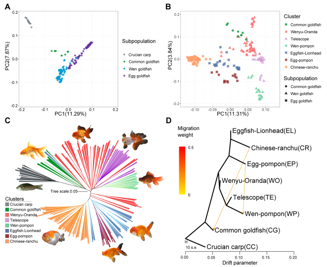 通過(guò)201個(gè)個(gè)體(16只野生鯽魚(yú)和185只代表性金魚(yú)變種,平均測(cè)序深度12.5 x)的系統(tǒng)發(fā)育樹(shù)構(gòu)建發(fā)現(xiàn)普通金魚(yú)與鯽魚(yú)親緣關(guān)系最近(圖4 A-C),進(jìn)一步結(jié)合系統(tǒng)發(fā)育樹(shù)和PCA分析確定各金魚(yú)變種的系統(tǒng)分化關(guān)系,區(qū)分普通金魚(yú)和卵金魚(yú)(無(wú)背鰭)和溫金魚(yú)(有背鰭),無(wú)背鰭金魚(yú)和有背鰭金魚(yú)進(jìn)一步分為不同的亞群。