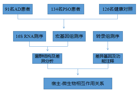 本文通過(guò)16S RNA測(cè)序、宏基因組測(cè)序及轉(zhuǎn)錄組測(cè)序技術(shù)研究了特異性皮炎和銀屑病患者皮膚微生物群落結(jié)構(gòu)以及皮膚基因表達(dá)模式。發(fā)現(xiàn)特異性皮炎和銀屑病與健康對(duì)照皮膚微生物組成存在顯著差異。特異性皮炎以金黃葡萄球菌為主并與宿主皮膚屏障功能、色氨酸代謝和免疫激活相關(guān)。銀屑病皮膚微生物群落與宿主基因表達(dá)存在微弱的關(guān)聯(lián)性。并為皮膚生態(tài)失調(diào)的生物標(biāo)志物和靶向治療提供基礎(chǔ)。