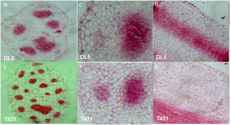 本研究利用石蠟切片法對其結(jié)構(gòu)變化及不育原因進(jìn)行觀察,觀察不育材料T431(圖1E)與對照材料(圖1B)成熟花柱的橫切,可以看出不育材料T431花柱中的維管束數(shù)目多于對照材料。同時(shí)形態(tài)觀察時(shí)發(fā)現(xiàn)不育材料花柱直徑顯著大于對照材料,維管束數(shù)目的增多可能直接導(dǎo)致了不育材料花柱直徑變大(圖1C, D, F, G)。觀察成熟花柱的細(xì)胞發(fā)現(xiàn)不育材料與對照材料花柱細(xì)胞大小沒有顯著差別。因此說明不育材料花柱伸長是由花柱細(xì)胞數(shù)目增多導(dǎo)致而非細(xì)胞體積變大導(dǎo)致。
