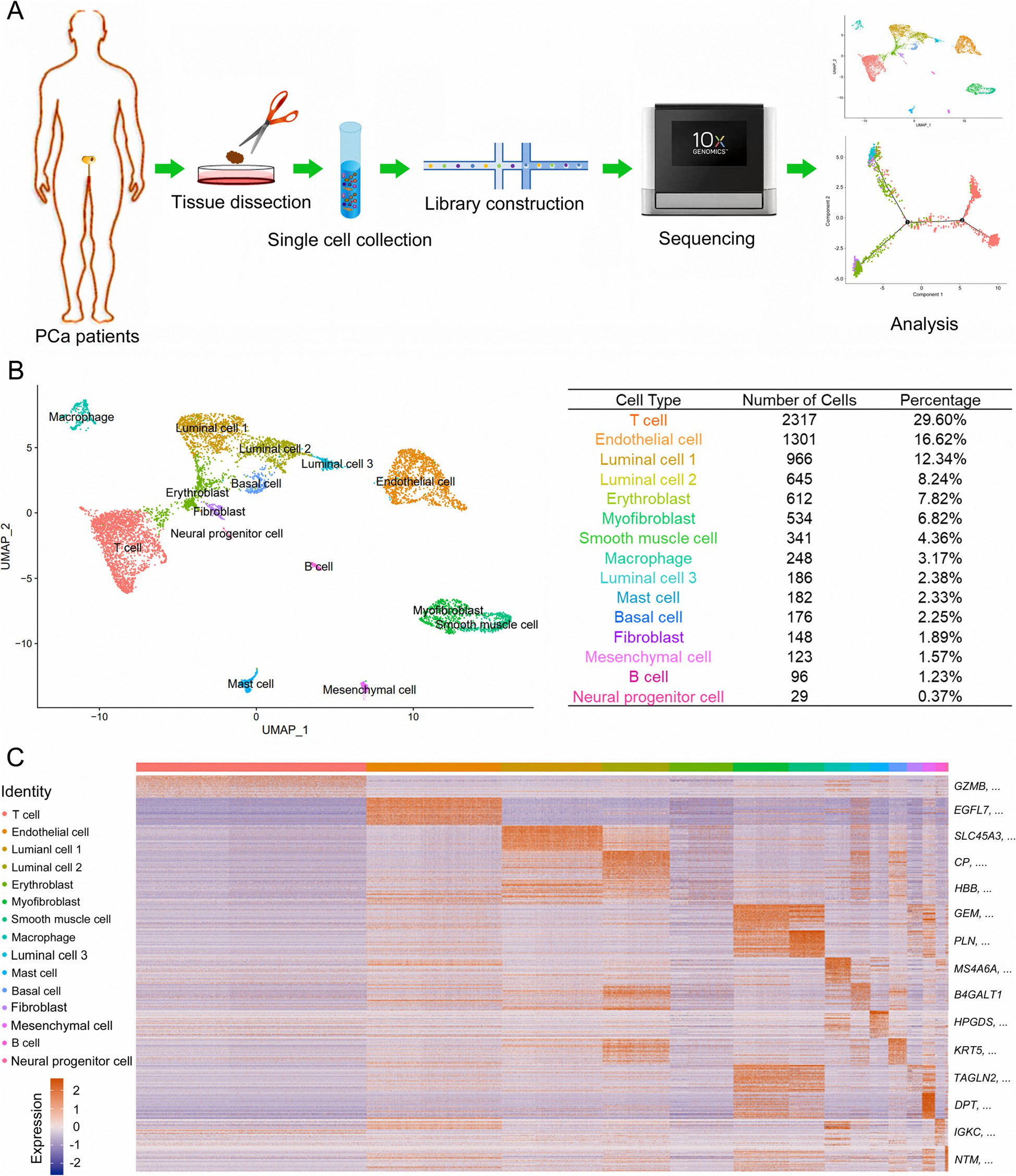 Fig1 通過單細胞測序鑒定PCa中不同的細胞類型。