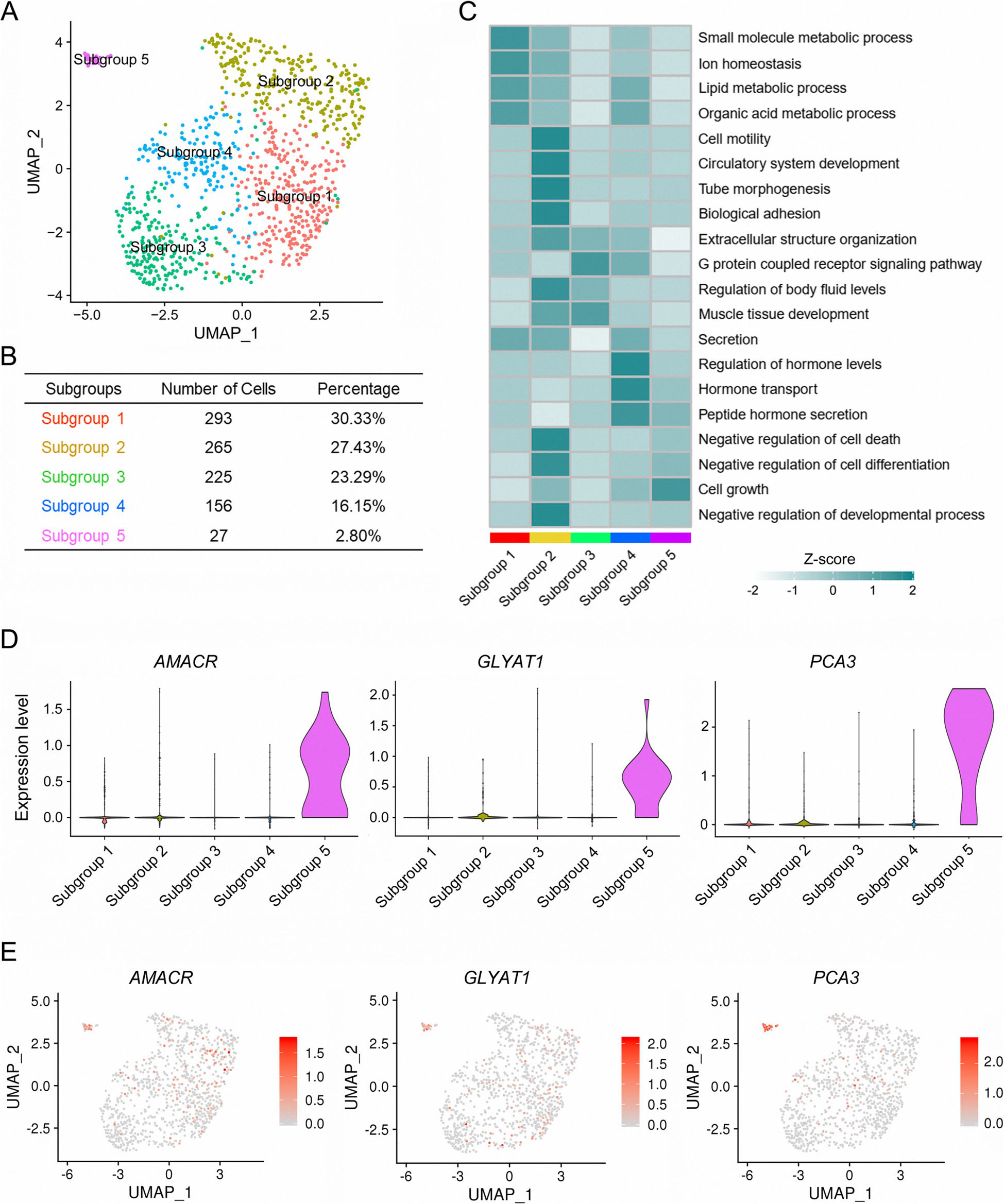 作者首先分析來自TCGA的公共PCa患者中每個管腔標(biāo)志基因的表達水平,以檢驗它們與PCa發(fā)生和發(fā)展的臨床相關(guān)性。相比之下,大多數(shù)1型管腔標(biāo)記基因在惡性程度較低的前列腺癌中的表達高于惡性程度高或正常前列腺,這表明在前列腺癌的發(fā)生和早期發(fā)展中有潛在的作用(補充圖5)。因此,作者對1型管腔細胞進行了亞聚類,以確定引起PCa的亞群。PCA將1型管腔細胞分為5個亞組(圖5a,b)。分析每個亞組標(biāo)記基因的功能富集,亞組1與腫瘤細胞有絲分裂準(zhǔn)備所必需的生物分子代謝過程有關(guān),如脂質(zhì)代謝過程和有機酸代謝過程(圖5c)。與其他亞組相比,亞組2與細胞運動、管形態(tài)發(fā)生和細胞死亡負(fù)調(diào)控有關(guān),這些過程對腫瘤的遷移和生長至關(guān)重要(圖5c)。亞組3主要參與G蛋白偶聯(lián)受體信號通路和肌肉組織發(fā)育(圖5c)。第4亞組與PCa相關(guān)的過程,包括激素水平的調(diào)節(jié),激素轉(zhuǎn)運和肽激素轉(zhuǎn)錄(圖5c)。相比之下,第5亞群的獨特功能主要集中在細胞生長(圖5c)。VlnPlot和特征圖顯示,AMACR、甘氨酸鈉基轉(zhuǎn)移酶樣1(GLYATL1)和PCA3在5亞組中特異表達(圖5d,e)。有趣的是,AMACR是一種在前列腺癌中高度表達的過氧化物酶體酶,參與支鏈脂肪酸和膽汁酸中間產(chǎn)物的β-氧化,對PCa的發(fā)生和發(fā)展至關(guān)重要。PCA3是一種非編碼RNA,在PCa細胞系、原發(fā)組織甚至PCa患者尿液中高表達。這兩個5亞組的標(biāo)記物已經(jīng)被用于PCa的診斷和分層,這意味著5亞組可能是臨床上PCa診斷和分層所必需的一組不同的細胞。