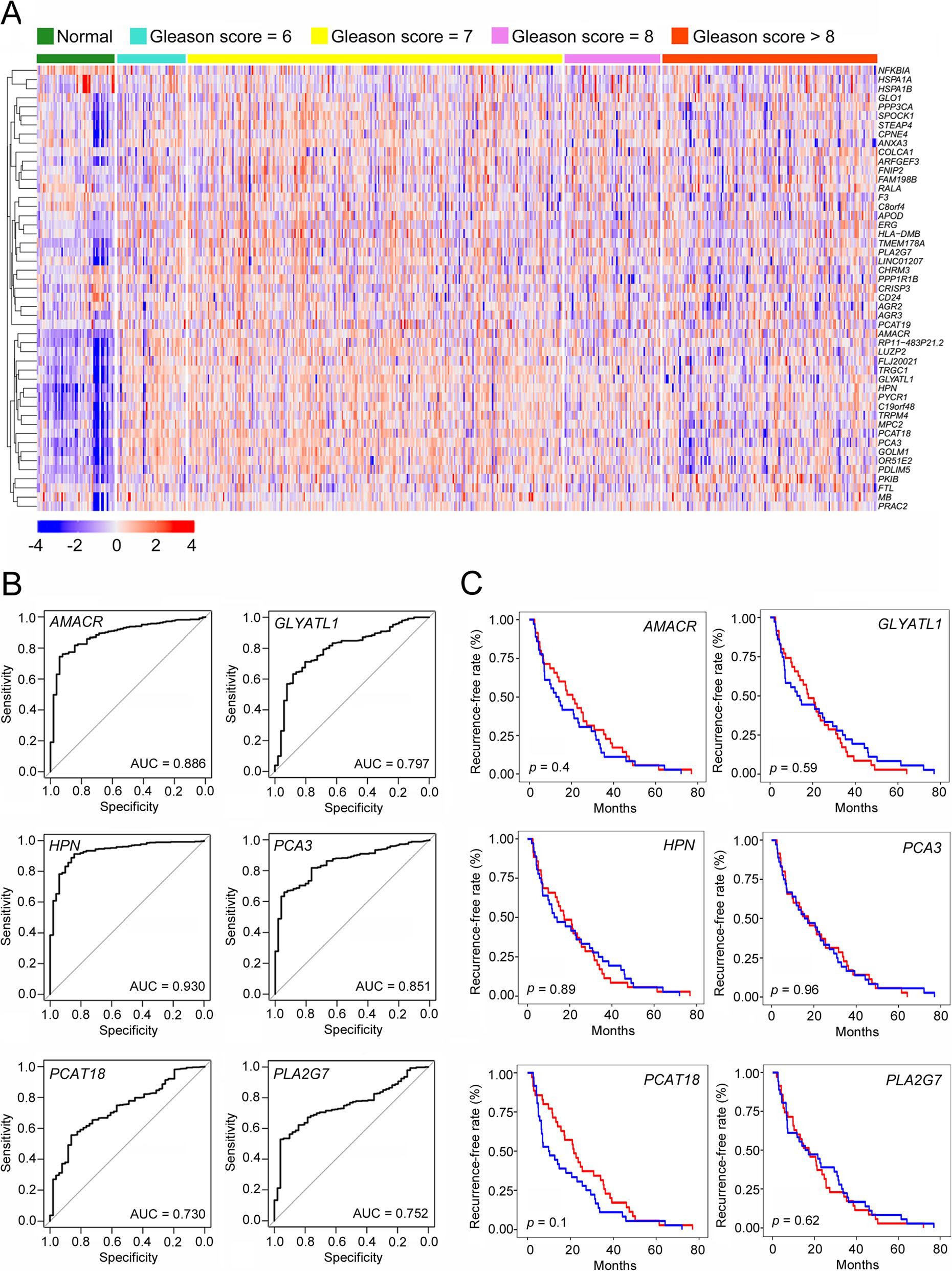 分析TCGA患者Ⅰ型管腔亞群的臨床相關(guān)性及其標(biāo)記基因的表達模式。正常前列腺中大多數(shù)1-4亞組標(biāo)記基因的表達水平與PCa組織中的相似甚至更高。相比之下,第5亞組的標(biāo)記基因在PCa組織中高表達,尤其是在Gleason評分為6或7的患者中,這表明在PCa的發(fā)生和早期發(fā)展中有潛在的作用(圖6a)。通過ROC分析,我們進一步鑒定了5亞組中6個特異性和敏感性最高的標(biāo)記基因,包括AMACR、GLYATL1、HPN、前列腺癌基因PCA3,前列腺癌相關(guān)轉(zhuǎn)錄物18(PCAT18)和磷脂酶A2第七組(PLA2G7)(圖6b)?;?-基因集的ROC分析顯示了很強的PCa預(yù)測能力,AUC得分為0.937。此外,這些基因的表達模式不僅區(qū)分了PCa與正常前列腺,而且區(qū)分了早期PCa(Gleason評分=6)和高度惡性PCa(Gleason評分≥8)。許多PCa患者在1-2年內(nèi)表現(xiàn)出抗藥性,并復(fù)發(fā)為晚期PCa,如CRPC。第5亞組可能有助于PCa復(fù)發(fā)。然而,Kaplan-Meier分析顯示,這些基因在生化復(fù)發(fā)中沒有明顯的預(yù)測能力,無論是單獨的還是作為一個基因集(圖6c)??傊?,第5亞組的惡性細胞是PCa診斷和分層的關(guān)鍵,但與生化復(fù)發(fā)無關(guān)。