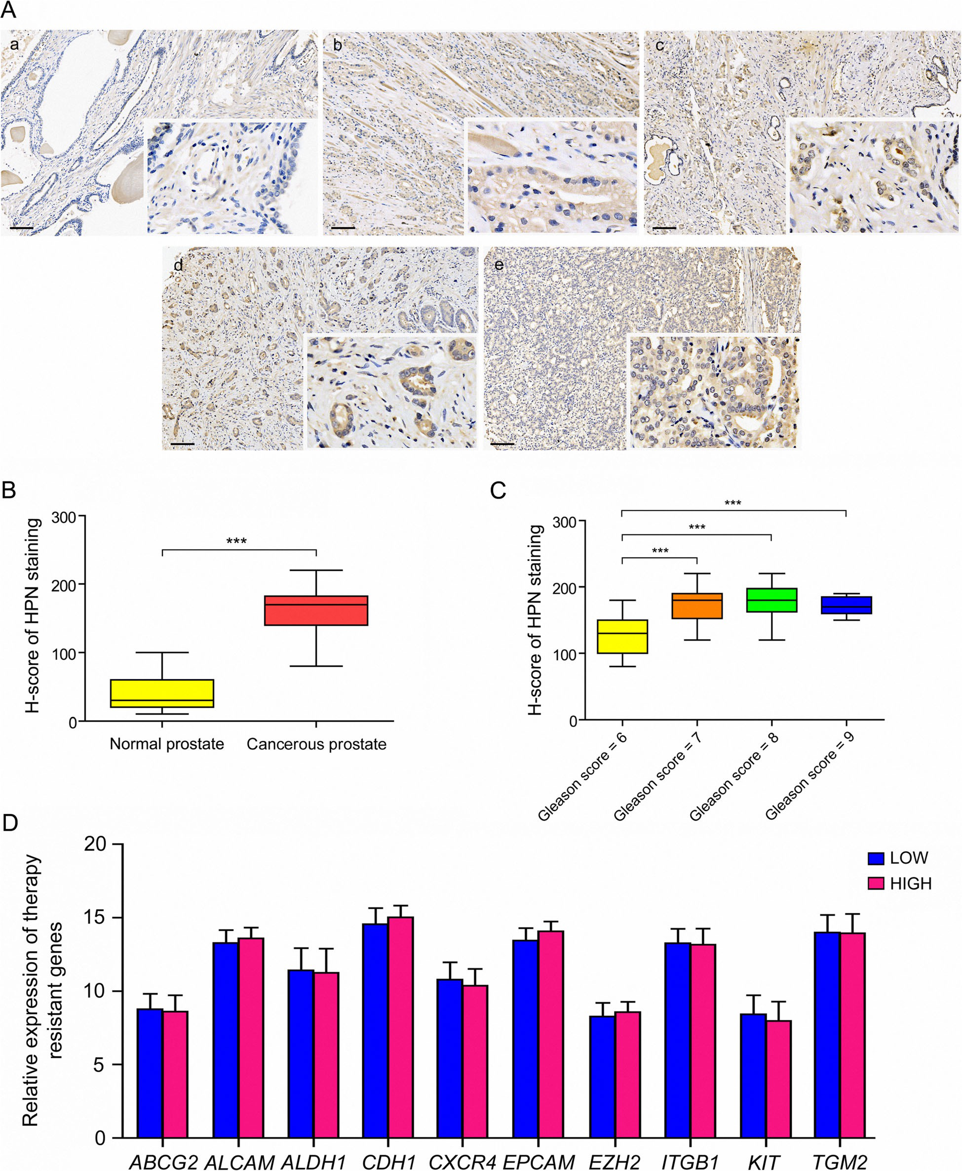 不同病理分級的癌組織之間(圖7a)。為了檢驗強度差異作者進一步用Hscore分析免疫染色評分,發(fā)現(xiàn)HPN在癌組織中的表達水平顯著增強(圖7b)。此外,高病理分級(Gleason評分=7,8,9)的腫瘤組織中HPN的表達水平顯著高于病理分級較低(Gleason評分=6)(圖7c)。因此,作者認(rèn)為HPN可能是臨床PCa診斷和分層更為特異、敏感的生物標(biāo)志物。為了探討HPN在預(yù)測PCa復(fù)發(fā)中的作用,作者根據(jù)HPN的表達水平將TCGA患者分為低和高兩組,然后分析了治療依從性標(biāo)記物的表達,包括ATP結(jié)合盒亞家族G成員2(ABCG2)、醛脫氫酶1(ALDH1)、受體酪氨酸激酶(KIT)的表達,活化白細胞粘附分子。