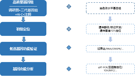 遺傳圖譜是目前經(jīng)典的功能基因定位策略,主要基于高通量測(cè)序技術(shù)開發(fā)單核苷酸多態(tài)性位點(diǎn)(SNP),并計(jì)算多態(tài)性標(biāo)記間的遺傳連鎖距離,構(gòu)建高密度遺傳圖譜,最后結(jié)合性狀調(diào)查對(duì)目標(biāo)區(qū)域進(jìn)行定位。數(shù)量性狀基因座(quantitative trait locus,QTL)是指基因組中引起數(shù)量性狀變異的座位。作物的產(chǎn)量、質(zhì)量、株型、生長發(fā)育等大多數(shù)重要經(jīng)濟(jì)性狀及農(nóng)藝性狀通常都為數(shù)量性狀。利用分子標(biāo)記,通過連鎖分析進(jìn)行QTL定位,是遺傳學(xué)中研究數(shù)量性狀相關(guān)功能基因的基本手段和確定分離并分離目標(biāo)基因的前提。而優(yōu)質(zhì)的基因組才能為性狀精準(zhǔn)定位提供有力支持。