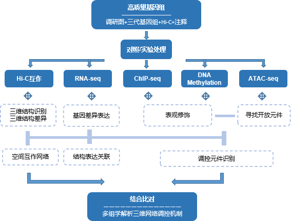 表觀遺傳(epigentics) “epi”表示“其上”或“超越”,genetics只設(shè)計(jì)基因的結(jié)構(gòu)層次,而epigenetics則涉及基因如何發(fā)揮其功能以及基因間的互作關(guān)系?;蚪M結(jié)合表觀調(diào)控可更加深入的剖析物種在何時(shí)、何地、以何種方式去應(yīng)用遺傳信息的指令。多種表觀遺傳研究手段間可相互組合,從三維基因、修飾表達(dá)、調(diào)控元件等多種層面解析不同調(diào)控原理。