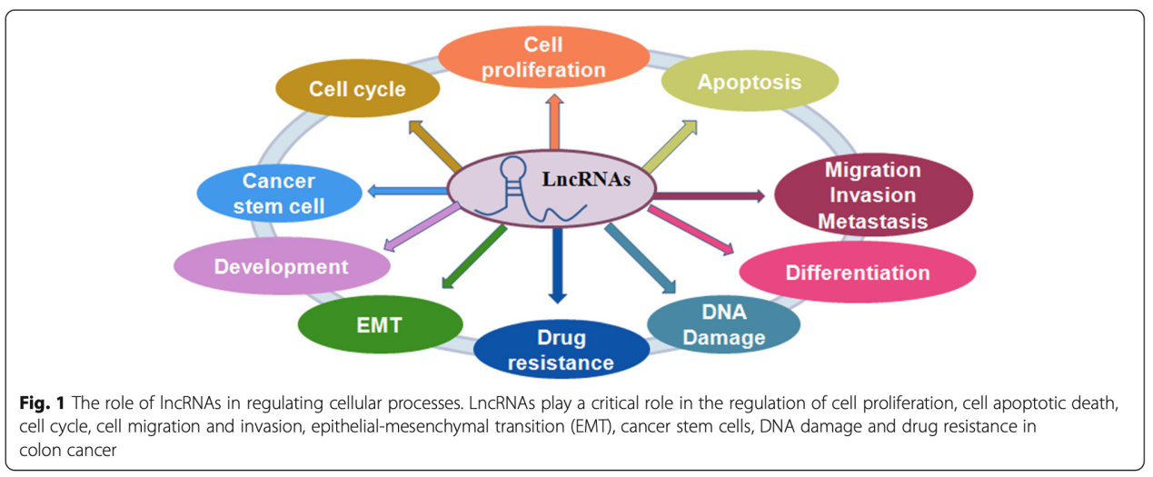 越來越多的證據(jù)表明,lncRNA在結(jié)腸癌的發(fā)生和發(fā)展中起著至關(guān)重要的作用,一項研究使用TCGA數(shù)據(jù)集的RNA測序數(shù)據(jù)在結(jié)腸腫瘤中鑒定了大約200個差異表達的lncRNA。LncRNA與患者預后,細胞增殖,細胞凋亡,細胞轉(zhuǎn)移和侵襲,細胞周期,上皮-間質(zhì)轉(zhuǎn)化(EMT),癌癥干細胞(CSC)和耐藥性相關(guān)(圖1)。