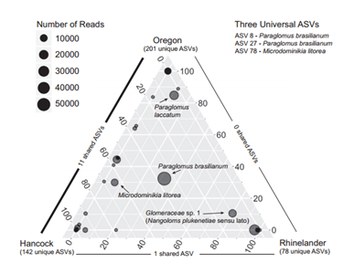 測(cè)序共產(chǎn)生190,700條高質(zhì)量、非嵌合體ccs序列,聚類產(chǎn)生436個(gè)?ASVs,通過(guò)稀釋性曲線趨于平緩表明AMF多樣性的采樣完整?;赨NITE數(shù)據(jù)的注釋結(jié)果,436個(gè)ASVs分布在球囊菌門(mén)(Glomeromycotina)的4個(gè)亞門(mén)中,共注釋得到7個(gè)科,13個(gè)及21個(gè)種。基于三元相圖表明一些高豐度的ASVs在不同實(shí)驗(yàn)單元中一致存在,暗示了柳枝稷中核心微生物組中的存在。本研究中也發(fā)現(xiàn)的一些ASVs可能是未被描述的AMF譜系,基于ASVs的系統(tǒng)發(fā)育分析表明,我們?cè)?em>Pervetustaceae?中發(fā)現(xiàn)了7個(gè)ASVs,這些ASVs在漢考克地區(qū)的沙質(zhì)土壤中很普遍,這表明它們可能在限水或營(yíng)養(yǎng)不良的條件下對(duì)柳枝稷具有一定的脅迫耐受性。