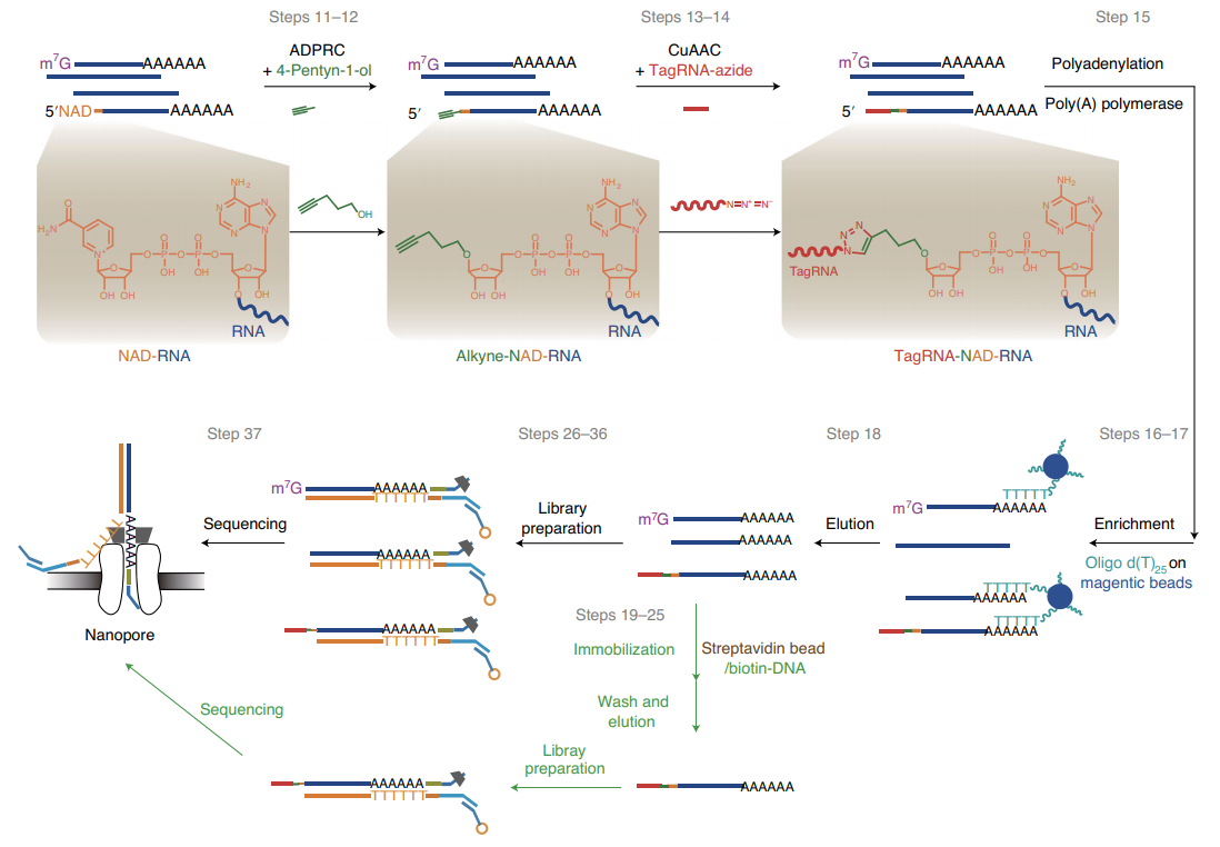 幾年前,開發(fā)了NAD captureSeq,用于NAD-RNA的轉(zhuǎn)錄組范圍分析。在NAD captureSeq中,腺苷二磷酸核糖基環(huán)化酶(ADPRC)用于將NAD +的煙酰胺部分替換為含炔烴的分子,稱為4-戊炔-1-醇。然后通過點擊化學反應(銅催化的疊氮炔炔環(huán)加成(CuAAC))將炔基化產(chǎn)物與生物素疊氮化物連接。用鏈霉親和素樹脂富集生物素標記的RNA,然后制備通過二代測序技術(shù)(NGS)測序的cDNA文庫。陰性對照RNA樣品的處理方法相同,但不使用ADPRC。如果與陰性對照相比,在ADPRC處理的樣品中富集了特定的RNA,則其某些轉(zhuǎn)錄本被認為是NAD +?capped。通過NAD captureSeq,已在細菌,酵母,植物和人類細胞中鑒定出NAD-RNA。缺點:非生物素化的RNA與鏈霉親和素樹脂的非特異性結(jié)合。由于NAD-RNA水平很低,因此非特異性結(jié)合可能會顯著降低敏感性并引入誤差。在生物素標記過程中RNA的斷裂以及隨后cDNA文庫的構(gòu)建導致NAD-RNA總體序列結(jié)構(gòu)信息的丟失。