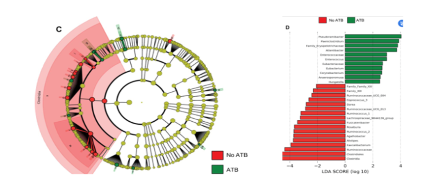 作者研究了ATB對GM組成的影響。ATB的使用與Shannon和Inverse Simpson指數(shù)減少有關(guān)(圖1A)。在分析ATB和無ATB組beta多樣性時,聚類到兩個clusters(圖1B)。未接受ATB治療的患者糞便中富集Clostridia,尤其是Ruminococcaceae UCG 13、Clostridiales?和?Agathobacter(圖1C)。而接受ATB治療的患者糞便中富集Hungatella(圖1D)。