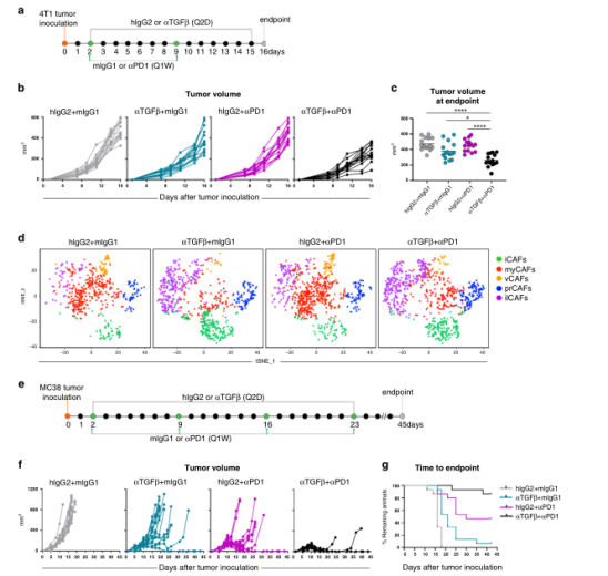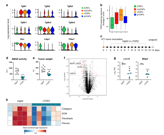 綜上所述,這些數(shù)據(jù)促使我們研究TGFβ-阻斷劑在體內(nèi)對(duì)CAF表型和功能的相對(duì)影響。為此,6周齡雌性小鼠接種4T1腫瘤細(xì)胞,隨后用TGFβ阻斷抗體或同型對(duì)照處理,研究設(shè)計(jì)如圖2c所示。結(jié)果表明這種腫瘤進(jìn)展的延遲似乎不是由抗TGFβ對(duì)腫瘤細(xì)胞的直接作用引起的,更可能是TGFβ阻斷后微環(huán)境變化的結(jié)果。事實(shí)上,使用TGFβ中和抗體可導(dǎo)致整體基因表達(dá)的顯著差異,這在對(duì)大量冷凍腫瘤RNAseq分析中得到證實(shí)(圖2f)。與這些發(fā)現(xiàn)一致的是,我們通過分析與膠原沉積和纖維化相關(guān)的基因特征,描述了抗tgfβ治療小鼠腫瘤中整體促纖維化程序的顯著減少(圖2h)。綜上所述,這些數(shù)據(jù)表明靶向TGFβ影響了腫瘤微環(huán)境中的成纖維細(xì)胞動(dòng)力學(xué)。