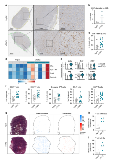 TGFβ-中和后CAF重塑,特別是具有潛在T細(xì)胞調(diào)節(jié)活性的CAF亞群的出現(xiàn),促使我們確定TGFβ-阻斷對(duì)建立抗腫瘤免疫反應(yīng)的影響。由于ilCAFs中T細(xì)胞趨化分子基因表達(dá)升高,CD8免疫組化染色顯示細(xì)胞毒性T細(xì)胞浸潤在治療組之間存在較大差異(圖6a)。流式細(xì)胞分析證實(shí)了TGFβ-阻斷作用下細(xì)胞毒性T細(xì)胞數(shù)量的增加(圖6c),支持TGFβ-阻礙可能導(dǎo)致免疫細(xì)胞反應(yīng)的全面覺醒。在單細(xì)胞水平上也證實(shí)了這些發(fā)現(xiàn)。為了評(píng)估這種與浸潤T細(xì)胞組織分布相關(guān)的激活程度,我們隨后通過空間轉(zhuǎn)錄組分析生成了與T淋巴細(xì)胞存在及其活性相關(guān)基因的腫瘤路圖。