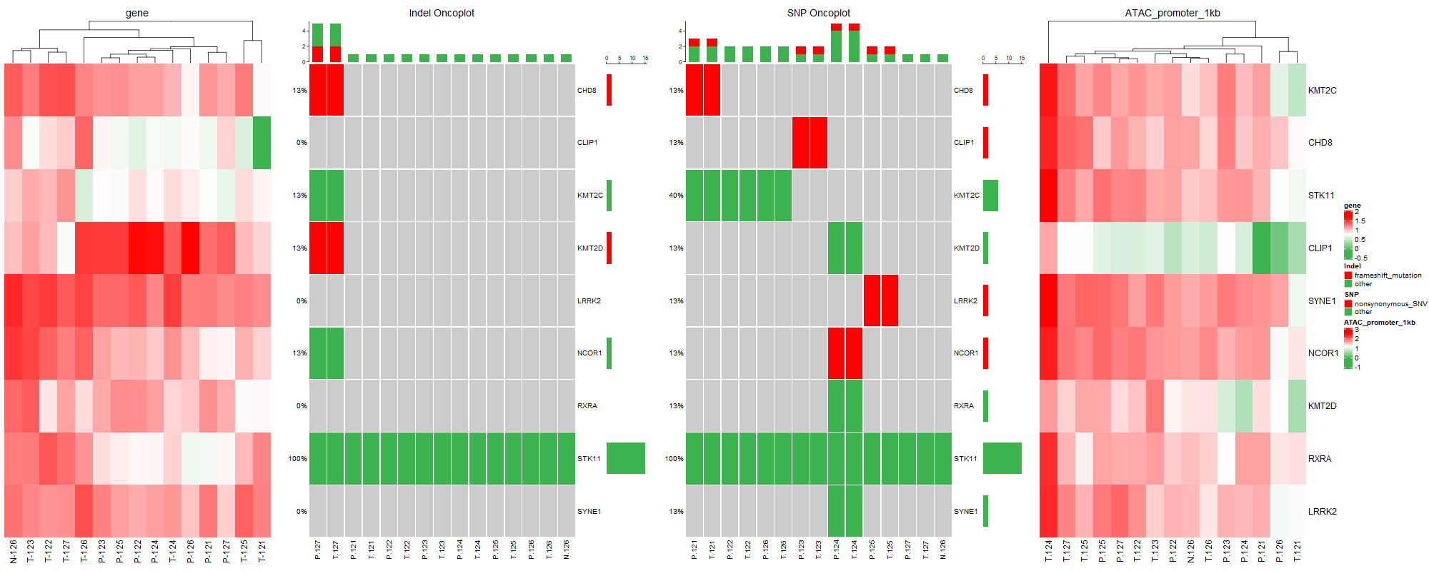 rownames(mat)<-mat$Gene mat<-mat[which(rownames(mat)%in%test$gene_symbol),] mat<-mat[,-1] mat[is.na(mat)]<-"" #mat<-str_replace("nonframeshift?insertion","other","") mat<-Replace(mat,from?=?"^.$",to?=?"",pattern?=?"") mat<-Replace(mat,from?=?"^,.",to?=?"",pattern?=?"") mat<-Replace(mat,from?=?",.$",to?=?"",pattern?=?"") mat<-Replace(mat,from?=?"^.,",to?=?"",pattern?=?"") mat<-Replace(mat,from?=?"stopgain",to?=?"other",pattern?=?"") mat<-Replace(mat,from?=?"stoploss",to?=?"other",pattern?=?"") mat<-Replace(mat,from?=?"unknown",to?=?"other",pattern?=?"") mat<-Replace(mat,from?=?"^synonymous?SNV$",to?=?"other",pattern?=?"") mat<-Replace(mat,from?=?"^nonsynonymous?SNV$",to?=?"nonsynonymous_SNV",pattern?=?"") mat<-Replace(mat,from?=?"synonymous?SNV,nonsynonymous?SNV",to?=?"nonsynonymous_SNV",pattern?=?"") mat<-Replace(mat,from?=?"nonsynonymous?SNV,synonymous?SNV",to?=?"nonsynonymous_SNV",pattern?=?"") #oncoPrint(mat) mat<-as.matrix(mat) #指定變異類型的標簽,和數(shù)據(jù)中的類型對應(yīng) heatmap_legend_param<-list(title="SNP",at=c("nonsynonymous_SNV",?"other"),labels=c("nonsynonymous_SNV",?"other")) #設(shè)定標題 column_title<-"SNP?Oncoplot" ht3<-oncoPrint(mat,alter_fun?=?alter_fun,col=col,column_title=column_title,heatmap_legend_param?=?heatmap_legend_param,remove_empty_columns?=?F,remove_empty_rows?=?F,show_column_names?=?T,show_row_names?=T) data<-?read.delim("ATAC_promoter_1kb.xls",?row.names?=?1,?header=TRUE?,check.names?=?F) row.names(data)<-data$gene_symbol data<-data[which(rownames(data)%in%test$gene_symbol),] data=?data[,?5:19] data[is.na(data)]<-0 data<-data[which(rowSums(data)>0),] data?<-?log10(data+0.000001) data<-as.matrix(data) library(ComplexHeatmap) color.1?<-?colorRampPalette(rev(c("red",?"white",?"#3CB34E")))(100) ht4<-Heatmap(data,col=color.1,cluster_columns??=?T,cluster_rows?=?F,name?=?"ATAC_promoter_1kb",column_title?=?"ATAC_promoter_1kb",show_row_names?=?T,show_column_names?=?T) draw(ht1+ht2+ht3+ht4,gap=unit(0.8,"cm")) dev.off()