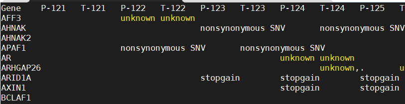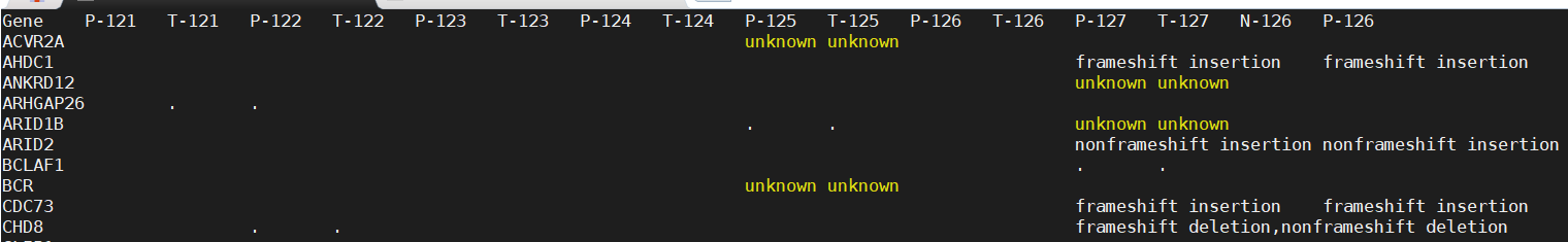 rownames(mat)<-mat$Gene mat<-mat[which(rownames(mat)%in%test$gene_symbol),] mat<-mat[,-1] mat[is.na(mat)]<-"" mat<-Replace(mat,from?=?"^.$",to?=?"?",pattern?=?"") #此處Replace是R包do中的函數(shù),將文件中的內(nèi)容替換成自己所需要的內(nèi)容 mat<-Replace(mat,from?=?"^,.",to?=?"?",pattern?=?"") mat<-Replace(mat,from?=?",.$",to?=?"?",pattern?=?"") mat<-Replace(mat,from?=?"^.,",to?=?"?",pattern?=?"") mat<-Replace(mat,from?=?"nonframeshift?deletion,frameshift?deletion",to?=?"frameshift_mutation",pattern?=?"") mat<-Replace(mat,from?=?"frameshift?deletion,nonframeshift?deletion",to?=?"frameshift_mutation",pattern?=?"") mat<-Replace(mat,from?=?"nonframeshift?deletion",to?=?"other",pattern?=?"") mat<-Replace(mat,from?=?"nonframeshift?insertion",to?=?"other",pattern?=?"") mat<-Replace(mat,from?=?"frameshift?deletion",to?=?"frameshift_mutation",pattern?=?"") mat<-Replace(mat,from?=?"frameshift?insertion",to?=?"frameshift_mutation",pattern?=?"") mat<-Replace(mat,from?=?"unknown",to?=?"other",pattern?=?"") #oncoPrint(mat) #指定變異類型的標簽,和數(shù)據(jù)中的類型對應(yīng) heatmap_legend_param<-list(title="Indel",at=c("frameshift_mutation",?"other"),labels=c("frameshift_mutation",?"other")) #設(shè)定標題 column_title<-"Indel?Oncoplot" ht2<-oncoPrint(mat,alter_fun?=?alter_fun,col=col,column_title=column_title,heatmap_legend_param?=?heatmap_legend_param,remove_empty_columns?=?F,remove_empty_rows?=?F,show_column_names?=?T,show_row_names?=T) mat?<-read.table("keygene.SNP.xls",head=T,sep="\t",stringsAsFactors?=?FALSE)