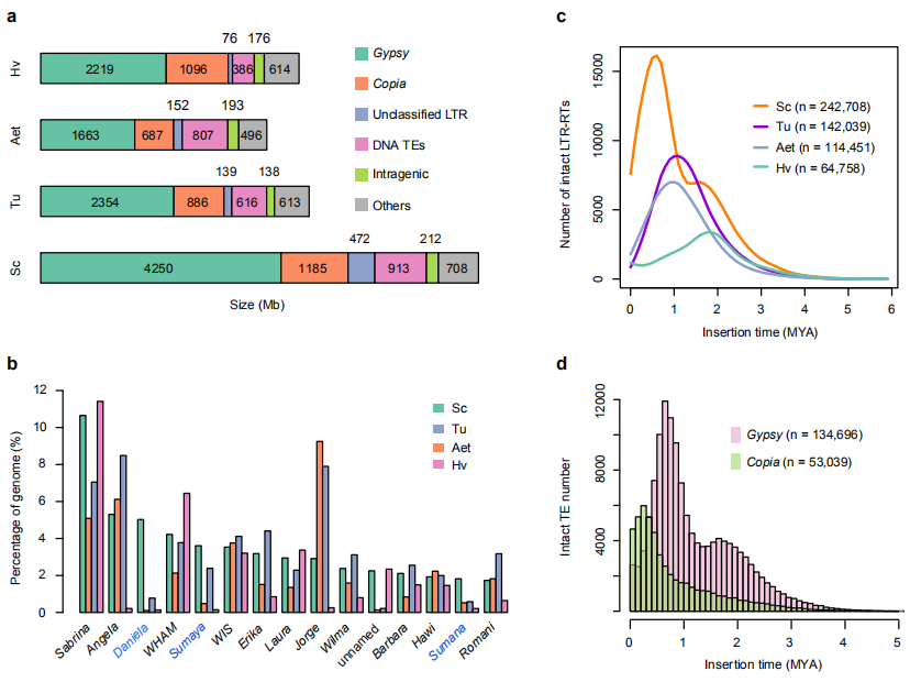 與烏拉爾圖小麥、節(jié)節(jié)麥及大麥的LTR-RTs進(jìn)行比較發(fā)現(xiàn):(1)Gypsy是威寧黑麥基因組擴(kuò)張的主要原因之一(Fig. 2a),并且有3個(gè)LTR-RT家族(Daniela, Sumaya, Sumana)在威寧黑麥中特異擴(kuò)張,其中Daniela的占比最高 (Fig. 2b)。(2)威寧黑麥中完整的LTR-RTs插入時(shí)間存在獨(dú)特的雙峰分布(Fig. 2c),最近一個(gè)擴(kuò)增峰出現(xiàn)在50萬年前,另出現(xiàn)在1.7 百萬年(MYA)左右(與大麥相同) (Fig. 2c)。(3)這種雙峰分布模式由Gypsy?RTs的擴(kuò)增主導(dǎo)(Fig. 2d)。