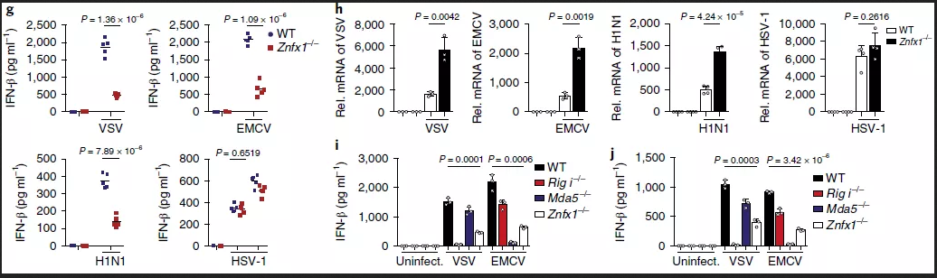 為了研究ZNFX1在體內(nèi)的生理作用,使用CRISPR/Cas系統(tǒng)生成了Znfx1-/-C57BL/6J小鼠。Znfx1-/-小鼠存活,沒(méi)有明顯的生理或行為異常。在這項(xiàng)研究中使用了六至八周大的小鼠。首先,分離野生型和Znfx1-/-小鼠的BMDM并用VSV、EMCV、H1N1或HSV-1感染,與野生型相比,Znfx1-/-BMDM的IFN-α或IFN-β分泌較低。RNA病毒感染后,包括VSV、EMCV和H1N1,但不包括HSV-1(圖2g),Znfx1-/-BMDM中檢測(cè)到較高的病毒mRNA水平,但在HSV-1感染的細(xì)胞中未檢測(cè)到較高的病毒mRNA水平(圖2h)。與野生型相比,Znfx1-/- MEF和A549細(xì)胞在RNA病毒感染VSV和EMCV后表現(xiàn)出較低的IFN-β分泌(圖2i,j)。