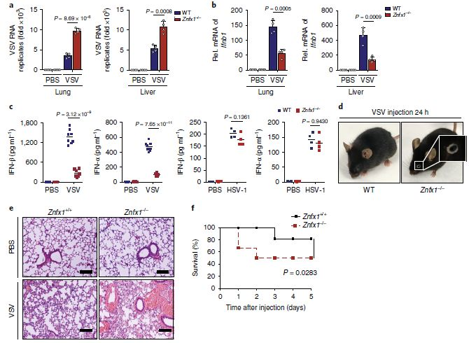 ZNFX1在宿主體內(nèi)對(duì)抗病毒感染的防御中的重要性:通過(guò)尾靜脈向野生型和Znfx1-/-小鼠注射了VSV。與野生型小鼠相比,Znfx1-/-小鼠的肺和肝中的VSV復(fù)制增強(qiáng)了(圖3a),隨著肺和肝中Ifnb1表達(dá)的減少,在Znfx1-/-小鼠中血清中IFN-α和IFN-β的分泌降低(圖3b,c)。而HSV-1感染后,Znfx1-/-和野生型小鼠之間血清中的IFN-α和IFN-β沒(méi)有差異(圖3c)。有趣的是,VSV感染一天后,Znfx1-/-小鼠中有80%患有結(jié)膜炎,這是VSV感染的早期癥狀(圖3d)。另外,觀察到VSV感染后炎性細(xì)胞更多地滲透到Znfx1-/-小鼠的肺中(圖3e),并且Znfx1-/-小鼠在存活試驗(yàn)中對(duì)VSV感染的抵抗力較弱(圖3f)。這些數(shù)據(jù)表明,Znfx1缺乏后體內(nèi)產(chǎn)生較少的I型IFN,削弱了針對(duì)RNA病毒感染的先天免疫反應(yīng)。總之,ZNFX1專(zhuān)門(mén)針對(duì)RNA病毒發(fā)揮其抗病毒特性。