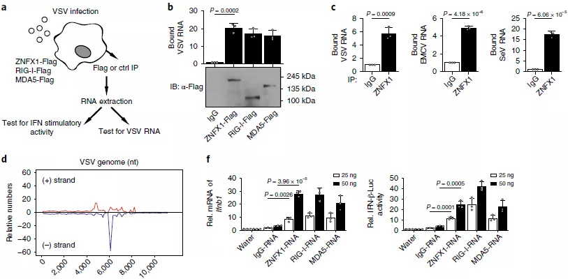 屬于RNA解旋酶SF2的許多基因被鑒定為結(jié)合病毒RNA的RNA病毒傳感器,因此假設(shè)屬于SF1的ZNFX1也可能作為RNA傳感器結(jié)合病毒RNA。為證實(shí)這一假設(shè),首先在293T細(xì)胞中過(guò)表達(dá)ZNFX1,然后進(jìn)行pulldown和qRT-PCR分析以確定ZNFX1與VSV-RNA的高結(jié)合能力(圖5a,b)。也檢測(cè)了內(nèi)源性ZNFX1與A549細(xì)胞中的VSV,EMCV和仙臺(tái)病毒(SeV)RNA的結(jié)合能力(圖5c)。通過(guò)用抗內(nèi)源性ZNFX1的抗體從免疫沉淀物中分離RNA來(lái)進(jìn)行RNA免疫沉淀(RIP)測(cè)序分析,將ZNFX1相關(guān)的RNA比對(duì)到VSV基因組(圖5d),優(yōu)先定位于約6,000-8,000 nt的VSV片段(圖5e)。值得注意的是,當(dāng)與ZNFX1相關(guān)的RNA轉(zhuǎn)染到A549細(xì)胞中時(shí),通過(guò)qRT-PCR和熒光素酶活性分析觀察到了Ifnb1的誘導(dǎo)轉(zhuǎn)錄和基于Ifnb1啟動(dòng)子的報(bào)告基因的誘導(dǎo)表達(dá)(圖5f)。