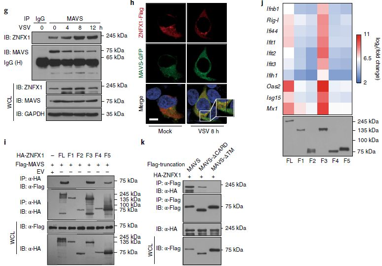 為了進(jìn)一步表征ZNFX1在感測(cè)病毒RNA時(shí)如何轉(zhuǎn)導(dǎo)抗病毒信號(hào),檢查了ZNFX1與涉及IFN產(chǎn)生的配體(包括TRIF、MyD88,MAVS和STING)的相互作用。免疫共沉淀實(shí)驗(yàn)表明,帶有HA標(biāo)記的ZNFX1與帶有Flag標(biāo)記的MAVS相關(guān),但與TRIF、MyD88和STING無(wú)關(guān)(圖6d)。免疫沉淀(Co-IP)實(shí)驗(yàn)進(jìn)一步表明,ZNFX1和MAVS在A549細(xì)胞中形成天然復(fù)合物,并且病毒感染后ZNFX1表達(dá)上調(diào)而增強(qiáng)了它們的結(jié)合(圖6e-g)。共聚焦顯微鏡實(shí)驗(yàn)還表明ZNFX1與MAVS共定位(圖6h)。使用一系列ZNFX1截短突變體進(jìn)行進(jìn)一步的免疫沉淀試驗(yàn)表明,全長(zhǎng)ZNFX1和含ARM的突變體,包括F3和F5,都可以與MAVS相互作用(圖6i)。與共免疫沉淀試驗(yàn)一致,ZNFX1的全長(zhǎng)和F3截短突變體過(guò)表達(dá)導(dǎo)致了Ifnb1和ISG的誘導(dǎo)表達(dá)以及受限制的VSV復(fù)制(圖6j)。此外,如果沒(méi)有跨膜(TM)域,ZNFX1不能與截短的MAVS相互作用(圖6k),ZNFX1的線粒體分布與其與MAVS的相互作用無(wú)關(guān)。