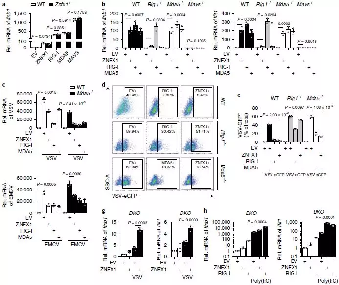 為了更深入地了解ZNFX1在抗病毒應(yīng)答中的作用,進(jìn)行了qRT-PCR或免疫印跡分析,以了解VSV感染或干擾素誘導(dǎo)劑聚肌胞苷酸(poly(I:C))刺激A549細(xì)胞、外周血單個(gè)核細(xì)胞(PBMC)或小鼠胚胎成纖維細(xì)胞(MEF)細(xì)胞后ZNFX1的表達(dá)上調(diào)(圖1b–d)。qRT-PCR也證實(shí)了靜脈注射VSV后小鼠脾臟和肺中Znfx1的豐度上調(diào)(包括胸腺、淋巴結(jié)脾臟和肺)(圖1e)。作者還對(duì)先前收集的芯片數(shù)據(jù)集(GDS4231/4214/1271/3210/6082/6063)進(jìn)行了統(tǒng)計(jì)分析,發(fā)現(xiàn)與健康對(duì)照相比,在HIV感染患者和猿猴免疫缺陷病毒(SIV)引起的腦炎猴子中,Znfx1的RNA水平明顯更高(圖1f,g)。此外,在不同的細(xì)胞類(lèi)型(包括巨噬細(xì)胞、樹(shù)突狀細(xì)胞和上皮細(xì)胞)中感染病毒后,Znfx1的轉(zhuǎn)錄顯著增加。這些數(shù)據(jù)都表明ZNFX1可能是抗病毒分子。
