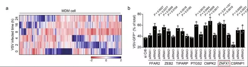作者首先分析了他們先前發(fā)表的被水皰性口炎病毒(VSV)感染的單核細(xì)胞衍生巨噬細(xì)胞(MDM)的IVT-SAPAS(in vitro transcription-sequencing alternative polyadenylation sites)數(shù)據(jù),并發(fā)現(xiàn)了許多表達(dá)改變的基因?!局耙寻l(fā)表文章的數(shù)據(jù)重新挖掘】通過(guò)比較受VSV感染的人MDM數(shù)據(jù)和小鼠腹膜巨噬細(xì)胞數(shù)據(jù),發(fā)現(xiàn)了一些共同的基因,它們被上調(diào)了三倍以上,包括FFAR2,ZEB2,TIPAP,PTGS2,CMPK2,ZNFX1和CSRNP1。隨后敲除A549細(xì)胞中的這些基因,用VSV-eGFP(VSV-增強(qiáng)型綠色熒光蛋白)感染細(xì)胞,流式細(xì)胞術(shù)檢測(cè)GFP陽(yáng)性細(xì)胞的百分比表明,敲減ZNFX1(其抗病毒作用尚未見(jiàn)報(bào)道)促進(jìn)了VSV感染。