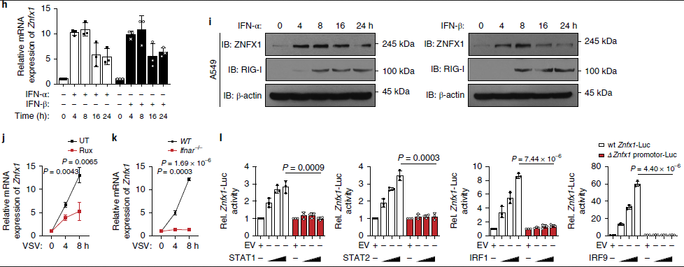 由于病毒感染導(dǎo)致ZNFX1的mRNA和蛋白質(zhì)水平表達(dá)均增強(qiáng),接下來(lái)通過(guò)將A549細(xì)胞與人重組IFN-α和IFN-β一起孵育來(lái)檢測(cè)ZNFX1是否為ISG。qRT-PCR和免疫印跡分析的結(jié)果表明ZNFX1的表達(dá)可以被IFN-α和IFN-β誘導(dǎo)(圖1h,i)。相比之下,JAK1抑制劑魯索替尼(ruxolitinib)可以抑制VSV對(duì)Znfx1 mRNA的誘導(dǎo),并且在Ifnar1-/-A549細(xì)胞中幾乎消失(圖1j,k)。