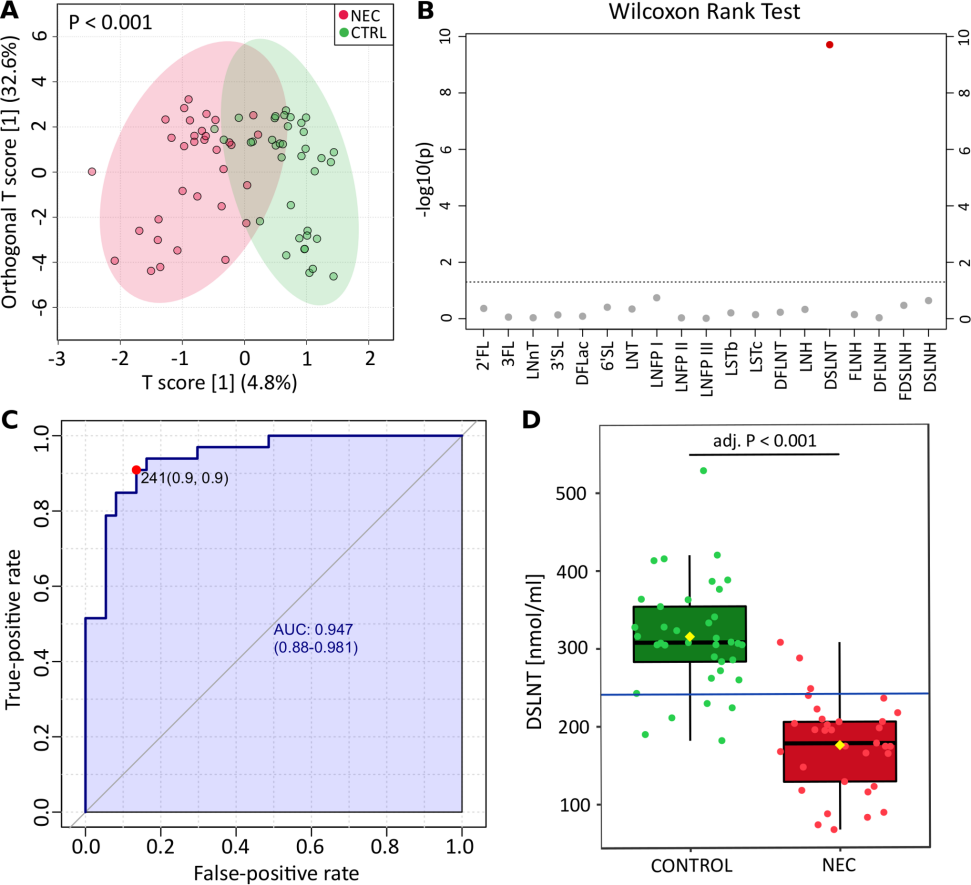 考慮到較低的DSLNT與NEC相關(guān)而不受分泌狀態(tài)的影響,作者探討了HMO作為NEC發(fā)育的生物標(biāo)志物的用途。單因素ROC曲線分析表明,241nmol/ml是MOM中DSLNT鑒別NEC和對照嬰兒的最佳濃度(圖1C和D)。AUC值為0.947,靈敏度為0.9,特異性為0.9。