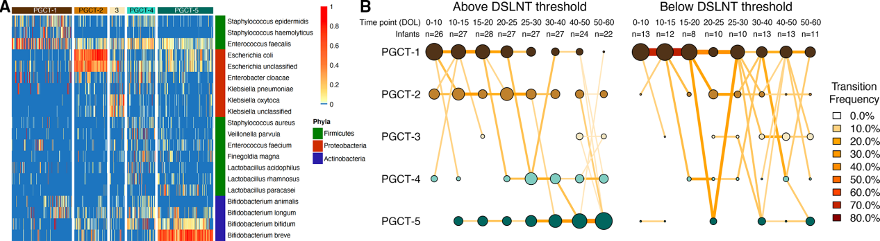 采用種水平數(shù)據(jù)對PGCTs進(jìn)行DMM聚類,5種PCGTs最理想(圖4A)。PGCT-1特征菌是高豐度Staphylococcus?spp和Enterococcus faecalis,PGCT-2高豐度Escherichia?spp,PGCT-3高豐度Klebsiella?spp,PGCT-4和PGCT-5高豐度Bifidobacterium?spp,B. breve在PGCT-5豐度高。根據(jù)樣本在所有時間點和clusters上的分布,在出生后前70天內(nèi)接受MOM中DSLNT高于和低于241nmol/ml的嬰兒微生物組差異顯著(圖4B)。在校正組間抽樣頻率不均勻后,最后一個時間點接受MOM超過DSLNT閾值2倍的嬰兒類似于PGCT-5,其Bifidobacterium高豐度(圖4A)。