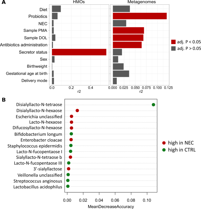 結(jié)果:相比對照組,NEC患兒母親母乳中HMO和DSLNT濃度顯著降低。MOM閾值為241nmol/ml對NEC的敏感性和特異性為0.9。NEC發(fā)病前的宏基因組測序顯示,NEC患兒Bifidobacterium longum相對豐度降低,Enterobacter cloacae相對豐度升高。低MOM DSLNT影響微生物組的縱向發(fā)展,這與過渡到以雙歧桿菌為主的早產(chǎn)兒腸道菌群類型的減少有關(guān),通常在年齡大一些的嬰兒中觀察到。疾病前HMO和宏基因組數(shù)據(jù)結(jié)合隨機(jī)森林分析區(qū)分嬰兒健康或是NEC準(zhǔn)確度為87.5%。