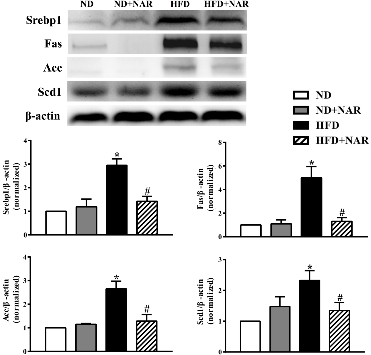 圖4 NAR對高脂小鼠肝臟脂肪生成相關(guān)蛋白表達(dá)的影響