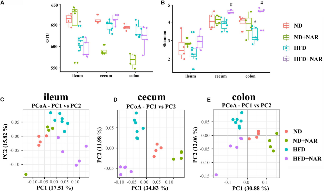 除HFD組回腸、盲腸和結(jié)腸的OTUs較ND組降低外,4組腸道不同部位的細(xì)菌OTUs無明顯差異(圖5A)。添加NAR降低了ND組小鼠盲腸和結(jié)腸OTUs。Shannon多樣性結(jié)果表明,高脂飼喂降低了結(jié)腸細(xì)菌多樣性,而NAR增加了盲腸和結(jié)腸細(xì)菌多樣性(圖5B)。高脂飼喂和NAR對回腸細(xì)菌多樣性沒有影響。