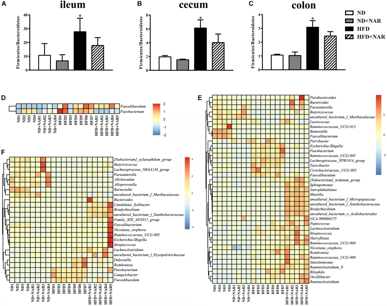PCoA分析顯示,各處理組回腸、盲腸和結(jié)腸中細(xì)菌組成具有明顯差異(圖5C-E)。與ND組相比,HFD增加了厚壁菌門/擬桿菌門(Firmicutes/Bacteroidetes)比值,HFD+NAR組NAR增加了厚壁菌門/擬桿菌門比值(圖6A-C)。因此NAR影響了腸道菌群組成。