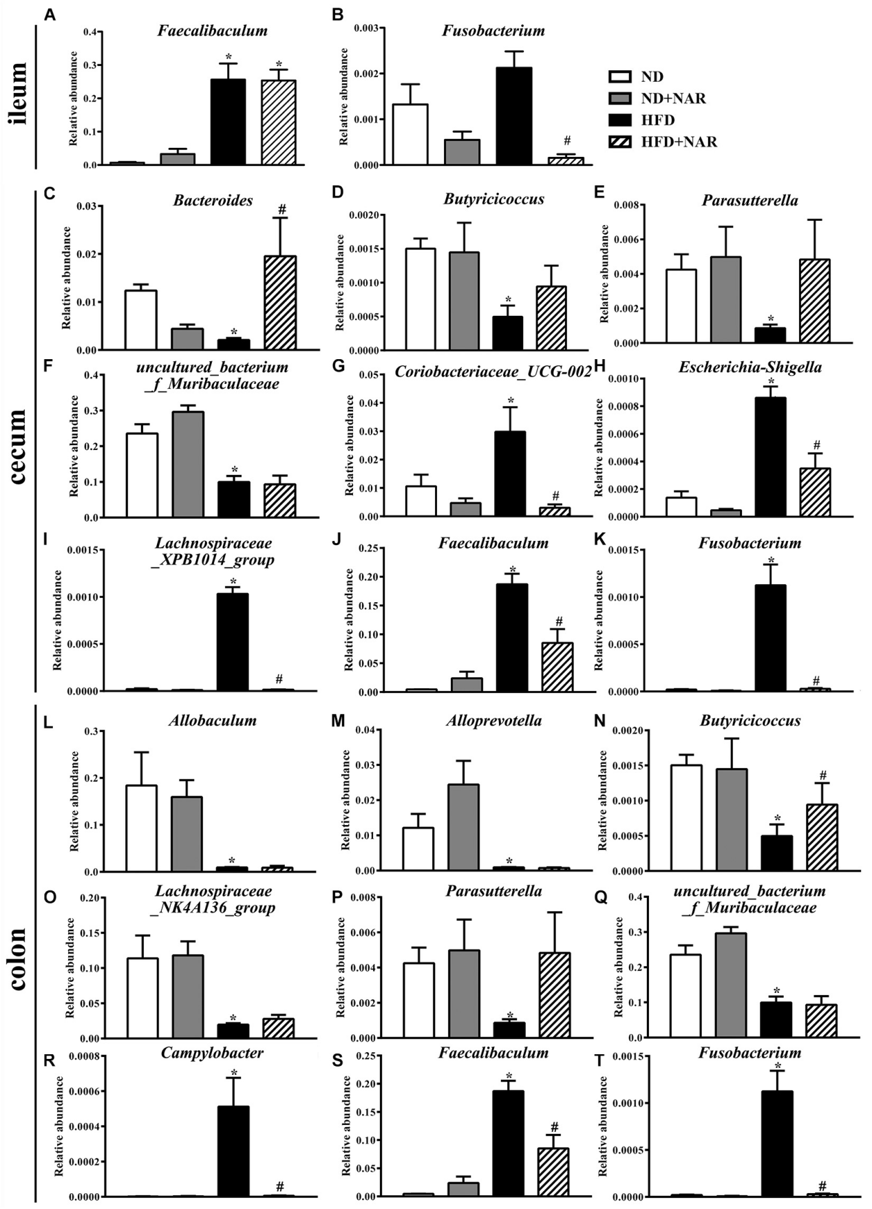 優(yōu)勢菌屬和差異菌屬熱圖顯示,補(bǔ)充NAR改變了HFD誘導(dǎo)的腸道細(xì)菌變化(圖6D-F)。與ND組相比,HFD組盲腸中Coriobacteriaceae_UCG-002、Escherichia-Shigella、Faecalibaculum、Fusobacterium、Lachnospiraceae_XPB1014_group、Parvibacter、Ruminococcaceae_UCG-005和Turicibacter相對豐度較高,Campylobacter、Dubosiella、Faecalibaculum和Fusobacterium在結(jié)腸中相對豐度較高,Bacteroides在盲腸中相對豐度較低,Butyricicoccus在結(jié)腸中相對豐度較低。NAR處理逆轉(zhuǎn)了這些效果。與ND組相比HFD飼喂小鼠腸道菌群顯示Butyricicoccus、Parasutterella和uncultured_bacterium_f_Muribaculaceae在盲腸中相對豐度較低,Allobaculum、Alloprevotella、Lachnospiraceae_NK4A136_group、Parasutterella和uncultured_bacterium_f_Muribaculaceae在結(jié)腸中相對豐度較低,F(xiàn)aecalibaculum在回腸中相對豐度較高。HFD+NAR組Bradyrhizobium、[Eubacterium]_nodatum_group、GCA-900066575、Jatrophihabitans、Massilia、Peptococcus、Sphingomonas、uncultured_bacterium_o_Acidobacteriales、uncultured_bacterium_f_Micropepsaceae和uncultured_bacterium_f_Xanthobacteraceae在盲腸中相對豐度較高,Bacteroides、Bradyrhizobium、Candidatus_Solibacter和 uncultured_bacterium_f_Xanthobacteraceae在結(jié)腸中相對豐度較高,F(xiàn)usobacterium在回腸中相對豐度較低。圖7為相對豐度改變的細(xì)菌統(tǒng)計(jì)結(jié)果,這些結(jié)果表明NAR調(diào)節(jié)了HFD小鼠腸道細(xì)菌。