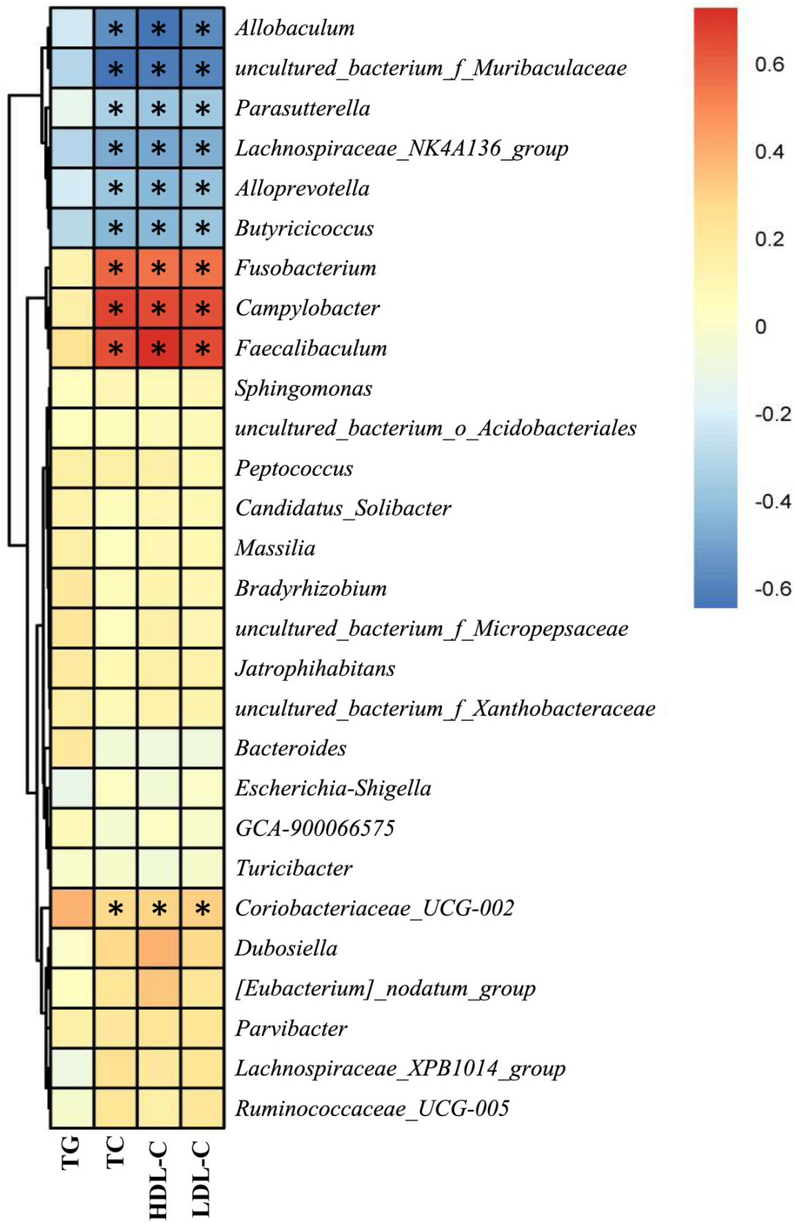 血清TC、HDL-C和LDL-C水平與細(xì)菌菌屬的相對豐度有關(guān),Allobaculum、Alloprevotella、Butyricicoccus、Lachnospiraceae_NK4A136_group、Parasutterella和uncultured_bacterium_f_Muribaculaceae與血脂水平呈負(fù)相關(guān),Campylobacter、 Coriobacteriaceae_UCG-002、Faecalibaculum和Fusobacterium與血脂呈正相關(guān)(圖8)。