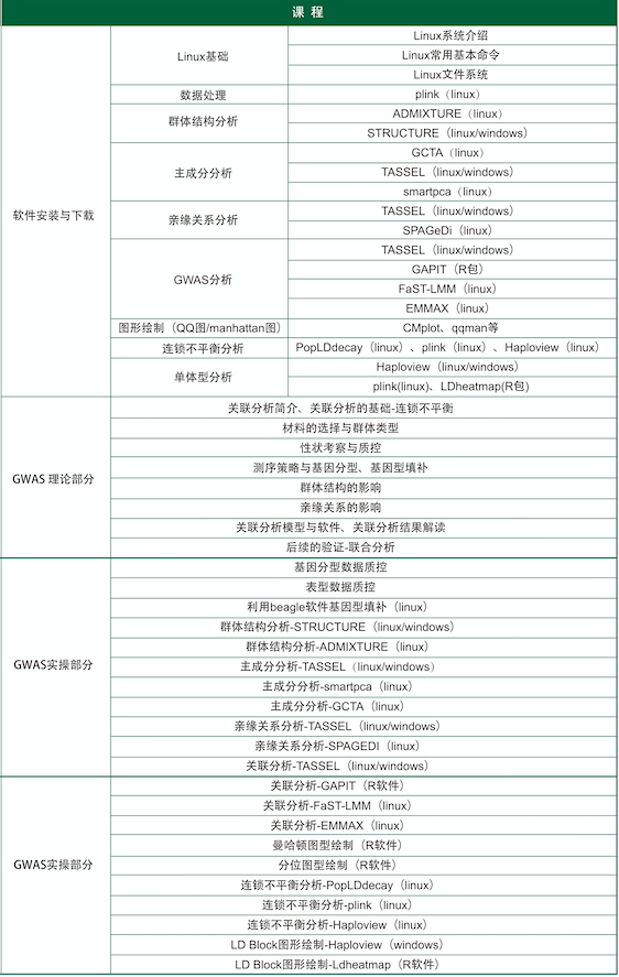 本課程主要從實(shí)踐入手,重點(diǎn)講解 GWAS 分析中用到的各種分析方法與常用分析軟件。包括群體結(jié)構(gòu)分析、主成分分析、親緣關(guān)系分析、連鎖不平衡分析、單體型分析等內(nèi)容。從原始數(shù)據(jù)開始,逐步完成分析內(nèi)容,并對分析內(nèi)容進(jìn)行整理與挖掘,將數(shù)據(jù)轉(zhuǎn)化成更直觀的圖形來展示最終的分析結(jié)果。同時(shí),課下還可反復(fù)觀看課程視頻,有問題隨時(shí)售后群中交流溝通,真正實(shí)現(xiàn)“線上學(xué)習(xí)理解,課后練習(xí)指導(dǎo),課下文檔復(fù)習(xí)”。