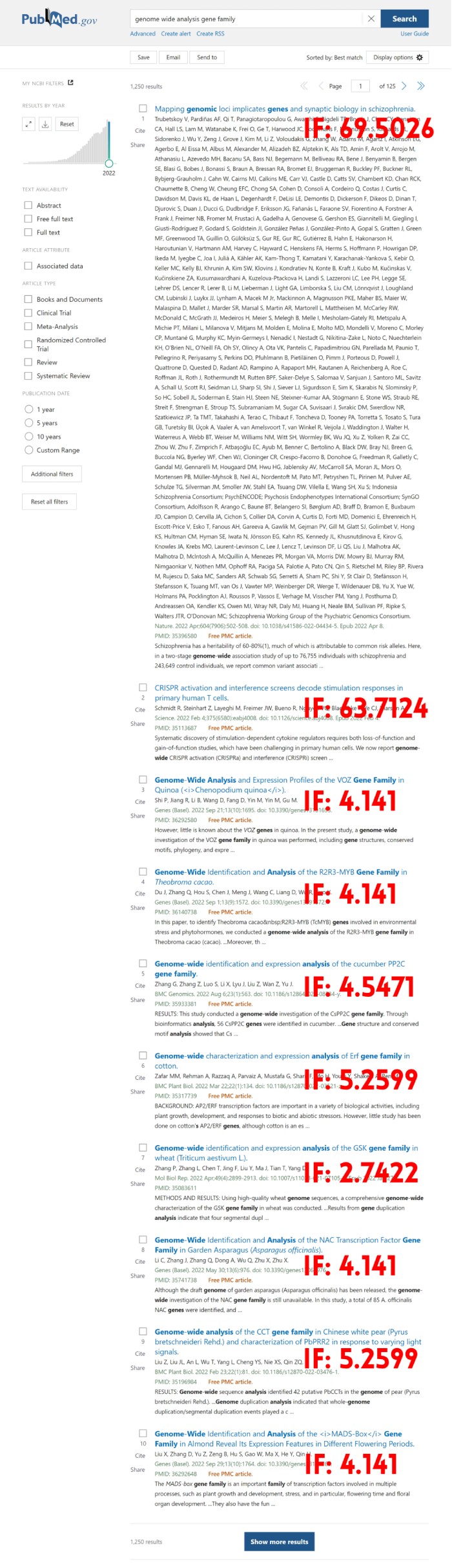 我們統(tǒng)計在2021年發(fā)表了1319篇相關(guān)的基因家族文章,而2022年到目前已經(jīng)發(fā)表了1241篇(使用genome wide of gene family關(guān)鍵詞檢索)??梢钥吹交蚣易逦恼逻@種套路文章發(fā)文之大。且如果進化做的好,可以分析一個基因家族在多個物種中演化規(guī)律,即可發(fā)更高水平的文章。