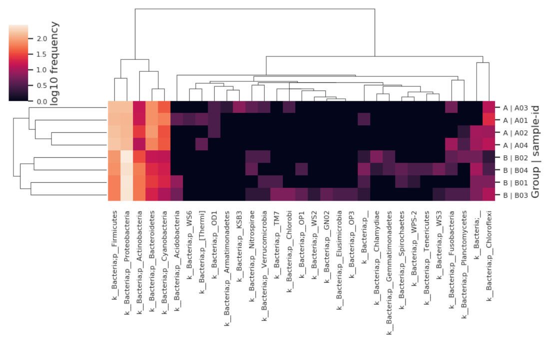物種豐度聚類熱圖:以顏色梯度來(lái)代表數(shù)據(jù)矩陣中數(shù)值的大小并根據(jù)物種或樣品豐度相似性進(jìn)行聚類的一種圖形展示方式。將高豐度和低豐度的物種分塊聚集,通過(guò)顏色梯度及相似程度來(lái)反映多個(gè)樣品群落組成的相似性和差異性。