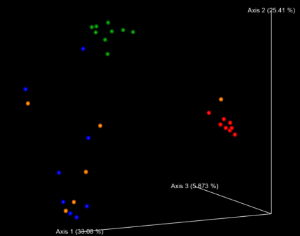 PCoA分析:原理是假設(shè)對(duì)N個(gè)樣品有衡量它們之間差異或距離的數(shù)據(jù),就可以用此方法找出一個(gè)直角坐標(biāo)系,將N個(gè)樣品表示成N個(gè)點(diǎn),而使點(diǎn)間的歐式距離的平方正好等于原來(lái)的差異數(shù)據(jù),實(shí)現(xiàn)定性數(shù)據(jù)的定量轉(zhuǎn)換,從多維數(shù)據(jù)中提取出主要的元素和結(jié)構(gòu)。