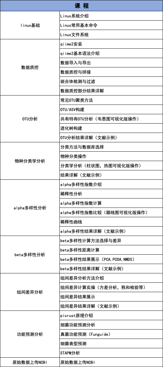 想學(xué)習(xí)如何分析微生物多樣性數(shù)據(jù)?想了解每步操作參數(shù)的意義?百邁客針對(duì)老師們對(duì)微生物多樣性內(nèi)容的需求,特開(kāi)辦微生物多樣性生信課程,面向全體科研工作者,系統(tǒng)學(xué)習(xí)微生物多樣性分析中常規(guī)內(nèi)容與分析過(guò)程。課程設(shè)計(jì)覆蓋linux基本操作、QIIME2數(shù)據(jù)分析、百邁客云分析三部分內(nèi)容。