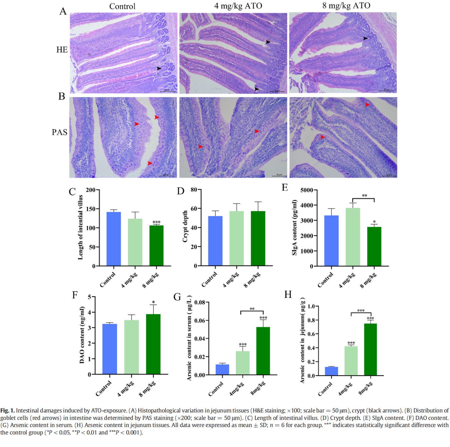 如圖?1G-H?所示,鴨空腸和血清中砷濃度呈劑量依賴性增加。與對照組相比,所有ATO治療組血清和空腸組織中砷含量均顯著升高(P < 0.001)。此外,8 mg/kg ATO?組的砷水平顯著高于?4 mg/kg ATO?治療組(P < 0.01?或?P < 0.001)。