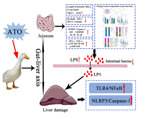 砷元素廣泛存在于自然界中,砷及砷化合物是常見的有毒有害類污染物,常見于受污染的土壤、河流和地下水中。然而,關(guān)于三氧化二砷?(ATO)?對水禽的腸-肝軸和隨之而來的肝毒性的影響的研究很少。在此,我們研究了?ATO?對鴨腸和肝臟的影響,并探討了腸肝軸在?ATO?誘導(dǎo)的肝毒性和腸道毒性中的作用。結(jié)果表明,ATO?暴露會導(dǎo)致腸道損傷、肝臟炎癥細胞浸潤和囊泡脂肪變性。此外,暴露于?ATO?的鴨子的腸道微生物群落顯示出顯著降低的α多樣性和細菌群落的改變。并且,ATO?暴露顯著降低了腸道屏障相關(guān)蛋白(Claudin-1、MUC2、ZO-1?和?Occludin)的表達,導(dǎo)致腸道通透性增加和脂多糖水平升高。同時,ATO?暴露還上調(diào)肝臟和空腸中與細胞凋亡相關(guān)的指數(shù)水平,并增加促炎細胞因子的產(chǎn)生(IFN-γ、TNF-α、IL-18?和?IL-1β)。我們進一步的機制研究表明,ATO?誘導(dǎo)的肝臟和空腸炎癥是由?LPS/TLR4/NF-κB?信號通路和?NLRP3?炎癥小體的激活引起的??傊@些結(jié)果表明ATO暴露可引起肝臟和空腸炎癥和細胞凋亡,間接腸肝軸通路可能在ATO誘導(dǎo)肝毒性的潛在機制中起重要作用