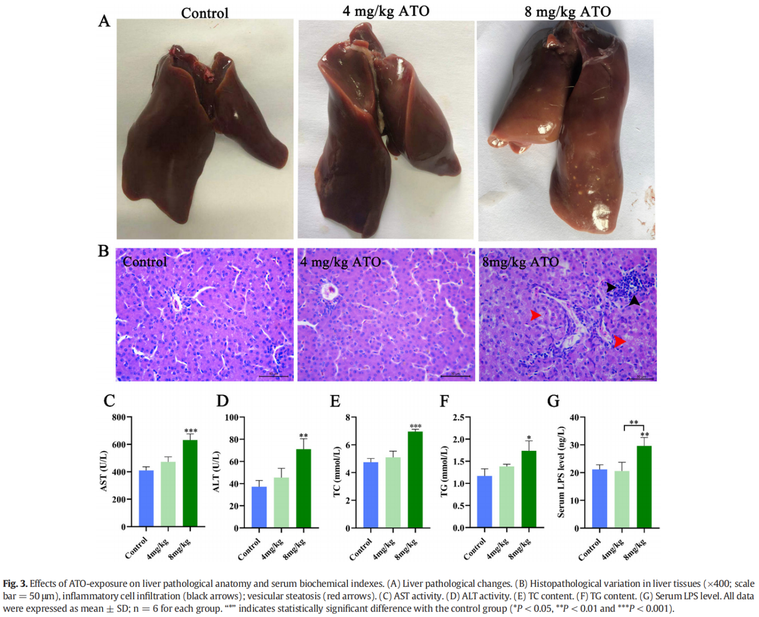 如圖?3A?所示,外觀學(xué)檢測顯示?8 mg/kg ATO?組的肝臟表面有許多白色結(jié)節(jié)性病變。同樣,組織病理學(xué)結(jié)果顯示,與對照組相比,8 mg/kg ATO?組的肝臟有炎癥細胞浸潤(黑色箭頭)和囊泡脂肪變性(紅色箭頭)(圖?3B)。此外,增加的血清?AST、ALT、TC?和?TG?水平證實?8 mg/kg ATO?組的鴨有嚴重的肝損傷和脂肪變性(P < 0.05?或?P < 0.01?或?P < 0.001,圖?3C-F)。值得注意的是,8 mg/kg ATO?治療組的血清?LPS?水平顯著高于對照組和?4 mg/kg ATO?組(P < 0.01,圖?3G)。