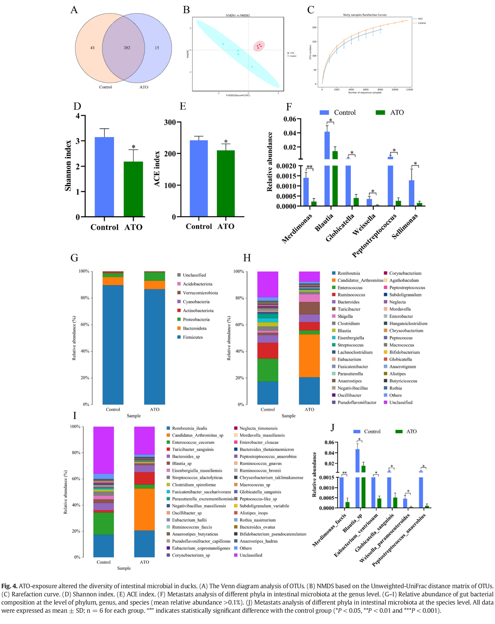 α?和?β?多樣性分析都用于評估對照組和?ATO?治療組之間腸道細菌群落多樣性的差異。如圖?4B?所示,NMDS?分析用于分析各組之間的?β-多樣性,ATO?治療組和對照組之間的腸道微生物群分布分別與每組聚類。此外,物種稀釋性曲線趨于相對平坦,說明測序數(shù)量和深度符合后續(xù)分析的要求(圖4C)。腸道微生物種群的α多樣性通過群落豐度(ACE)和多樣性指數(shù)(香農(nóng)指數(shù))來反映。與對照組相比,ATO?暴露顯著降低了?ACE?和香農(nóng)指數(shù)(P < 0.05,圖?4D-E),這表明?ATO?暴露顯著改變了鴨腸道微生物的豐富度和多樣性。