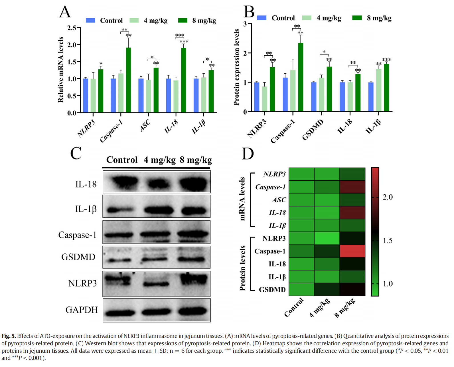 為了評估?ATO?誘導(dǎo)的炎癥小體激活是否與腸道損傷有關(guān),我們檢查了炎癥小體激活標志物的表達水平。從圖?5A?可以看出,NLRP3、Caspase-1、ASC、IL-1β?和?IL-18?的?mRNA?表達水平隨著?ATO?水平的增加而升高,與對照相比,8 mg/kg ATO?組和?4 mg/kg ATO?組出現(xiàn)顯著差異?(P < 0.05?或?P < 0.01?或?P < 0.001)。同時,NLRP3、Caspase-1、GSDMD、IL-1β?和?IL-18?的蛋白質(zhì)濃度在?8 mg/kg ATO?組中也顯著增加(P < 0.01?或?P < 0.001,圖?5B-C)。這些基因和蛋白質(zhì)的變化在熱圖中直觀地顯示出來(圖?5D)。這些結(jié)果表明,ATO?處理引發(fā)了鴨空腸組織中?NLRP3?炎癥小體的激活和細凋亡。