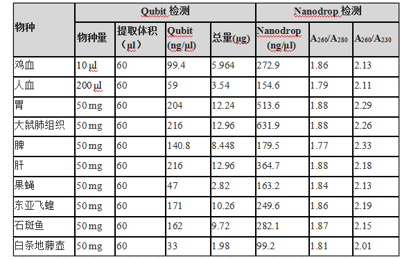 1.DNA濃度/純度檢測:提取不同動物組織中的DNA,然后檢測DNA的濃度和吸光度。結(jié)論:Qubit測得的DNA濃度較高;且A260/A280值在1.8~2.5之間,表明提取的DNA純度高。