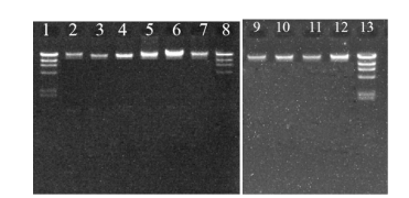 大鼠肺;Lane 6:小鼠脾臟;Lane 7:小鼠肝臟;Lane 8Marker;Lane 9:果蠅;Lane 10:東亞飛蝗;Lane 11:石斑魚;Lane 12:白條地藤壺;Lane 13λ-Hind Ⅲ DNA?Marker。