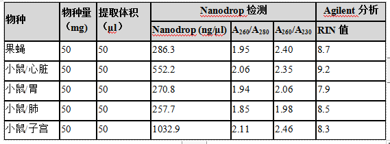 1.RNA濃度檢測:Nanodrop檢測A260/A280值在2.0左右,表明提取的RNA純度高,且濃度高。同時Agilent 2100生物分析儀檢測的RIN值接近10,表明RNA無降解,完整性好。