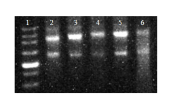 Lane 1:250 bp DNA Marker?Lane 2:小鼠/子宮;Lane 3:小鼠/肺;Lane 4:小鼠胃;Lane 5:小鼠/心臟;Lane 6:果蠅。