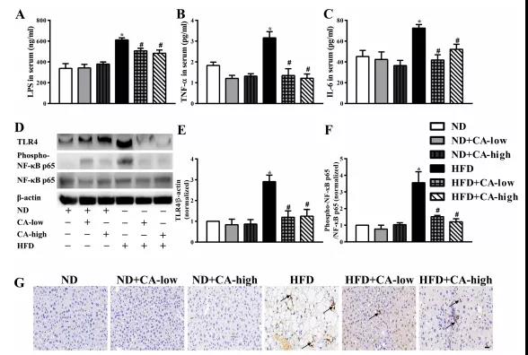 有報(bào)道稱,NAFLD的特征是腸道菌群改變、炎癥和腸道屏障破壞。肝組織炎癥被認(rèn)為是肝脂肪變性發(fā)展的驅(qū)動(dòng)因素,腸道源性脂多糖被認(rèn)為在肝臟炎癥中具有致病作用。最近的動(dòng)物實(shí)驗(yàn)研究關(guān)注了腸道菌群LPS在NAFLD發(fā)生中的作用。腸道源性LPS是革蘭氏陰性菌外膜的主要成分,通過TLR4信號(hào)通路和下游炎癥級(jí)聯(lián)反應(yīng)促進(jìn)炎癥反應(yīng)。有報(bào)道稱,在NAFLD模型中,與野生型小鼠相比,tlr4缺陷小鼠的肝損傷、炎癥和脂質(zhì)積累減少。此外,阻斷腸道菌群與宿主細(xì)胞之間的脂多糖- tlr4相互作用可以阻止高脂喂養(yǎng)小鼠NAFLD的啟動(dòng)和發(fā)展,這證實(shí)了脂多糖- tlr4通路在誘導(dǎo)NAFLD中具有非常重要的作用。與之前的研究結(jié)果一致,我們的研究表明,16周高脂飲食導(dǎo)致血清LPS和肝臟TLR4表達(dá)顯著增加,肝組織中磷酸化的NF-kB p65被激活,表明炎癥開始。同時(shí),高脂喂養(yǎng)小鼠血清TNF-a、IL-6水平升高,肝臟mpo陽(yáng)性細(xì)胞浸潤(rùn)。所有劑量的CA補(bǔ)充均顯著扭轉(zhuǎn)了上述現(xiàn)象;在添加ca的ND組中沒有觀察到顯著差異(圖4A-G)。