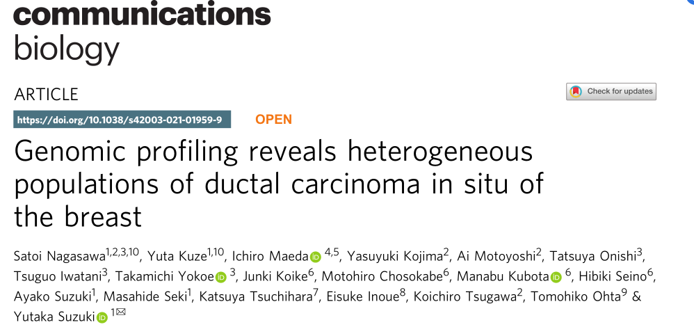 Nagasawa S, Kuze Y, Maeda I,?et al. Genomic profiling reveals heterogeneous populations of ductal carcinoma in situ of the breast. Commun Biol. 2021 Apr 1;4(1):438.